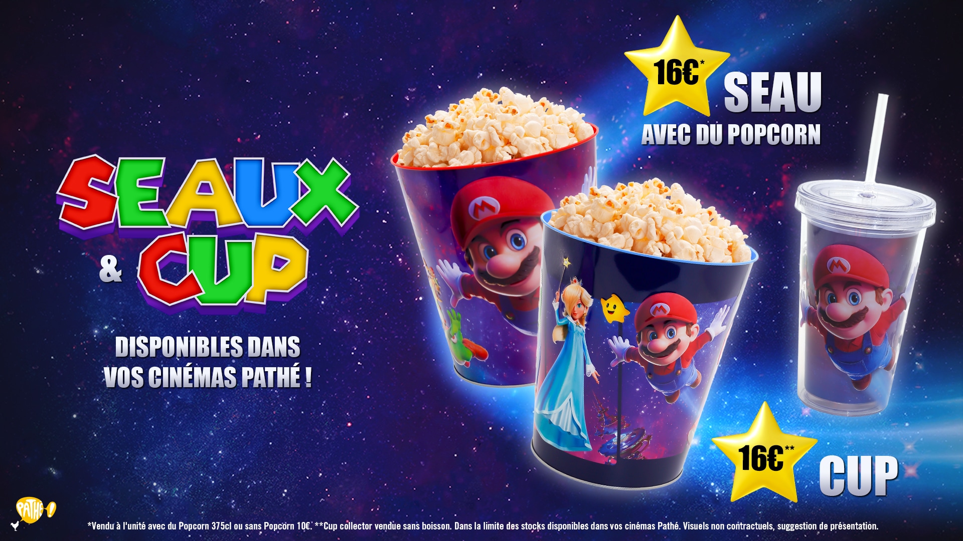 Et pour compléter votre collection et vous accompagner pendant votre voyage aux confins de la galaxie en compagnie de Mario, des seaux et des cups seront également disponibles dans vos cinémas !