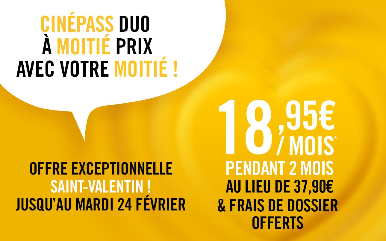 Jusqu’au 24 février inclus, pour toute souscription d’un abonnement en ligne CinéPass Duo bénéficiez de notre offre exceptionnelle : le CinéPass Duo à moitié prix soit 18,95€ par mois pendant 2 mois au lieu de 37,90€* ainsi que les frais de dossier offerts.